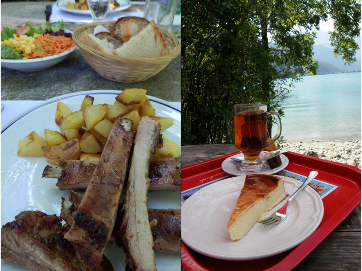 左:夏に戸外で食べると言ったらグリル 右:湖を眺めながらティータイム。至福の時だ swissinfo.ch