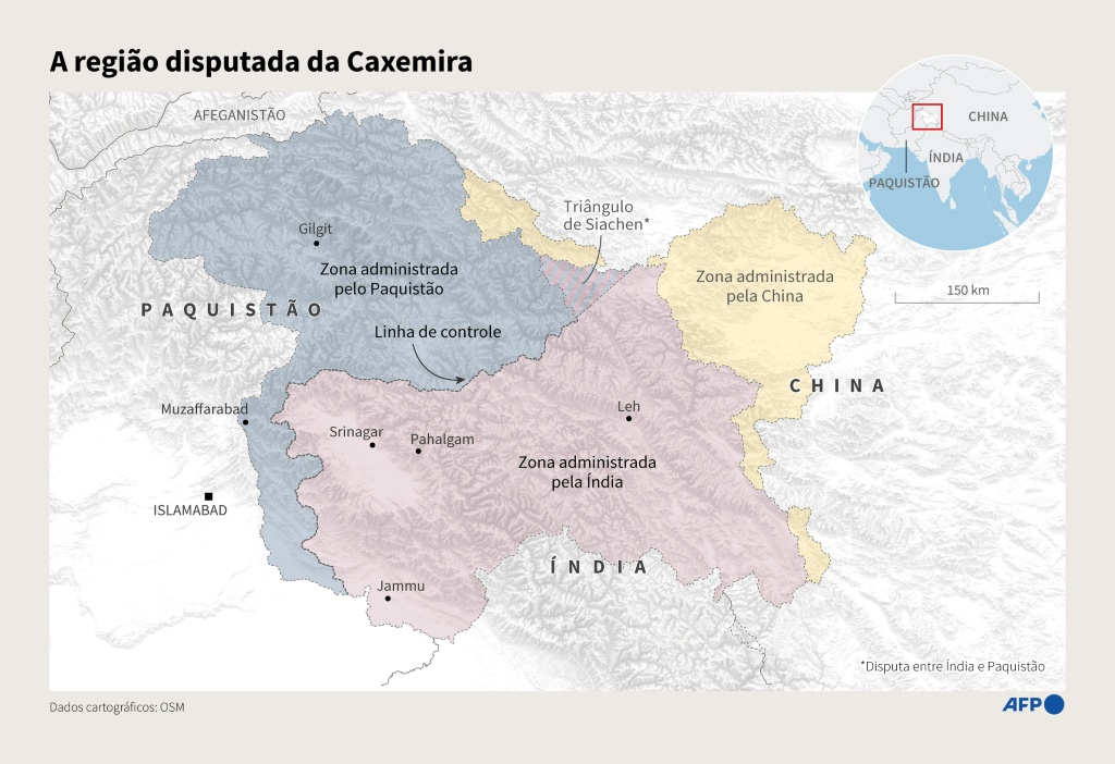 A tensão explodiu em 22 de abril, com um atentado na cidade turística de Pahalgam, na parte da Caxemira administrada pela Índia, que matou 26 pessoas, a maioria hindus.