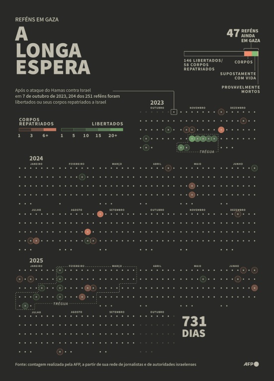 Vinte reféns israelenses supostamente vivos completaram, nesta terça-feira (7), dois anos de cativeiro na Faixa de Gaza, mas seu destino continua incerto em um momento em que ocorrem negociações indiretas no Cairo para sua libertação e pelo fim da guerra entre Israel e o Hamas.