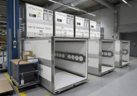 Nos hangares da empresa Va-Q-Tec, com sede em Wurzburg, Baviera, máquinas de elevação são utilizadas ao redor dos funcionários que montam painéis ou fabricam revestimentos a vácuo para equipar as caixas.