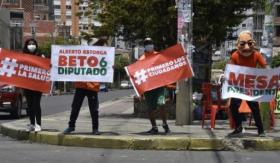 Apoiadores do candidato presidencial da Comunidade Cidadã, Carlos Mesa, exibem faixas de campanha em La Paz, 7 de outubro de 2020 afp_tickers