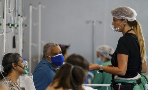No que antes era uma quadra de basquete, Marise e um grupo de médicos e enfermeiras atendem dezenas de doentes de covid-19, que matou mais de 320.000 pessoas no Brasil. Com frequência, a tosse de algum paciente se sobrepõe ao barulho dos aparelhos de ventilação.