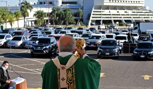 “Queremos dar uma resposta à necessidade dos fiéis de comunhão direta, o que não conseguem há 100 dias devido à pandemia”, disse o arcebispo de Assunção, monsenhor Edmundo Valenzuela. Os interessados em comungar acenderam os faróis de seus carros e padres se aproximaram dos veículos, reunidos em um estacionamento do aeroporto internacional Silvio Pettirossi para uma missa.