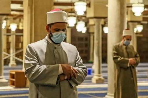 Muçulmanos fazem orações noturnas mantendo o distanciamento social na mesquita al-Azhar no Cairo, capital do Egito, durante o mês sagrado do Ramadã, 17 de maio de 2020 afp_tickers