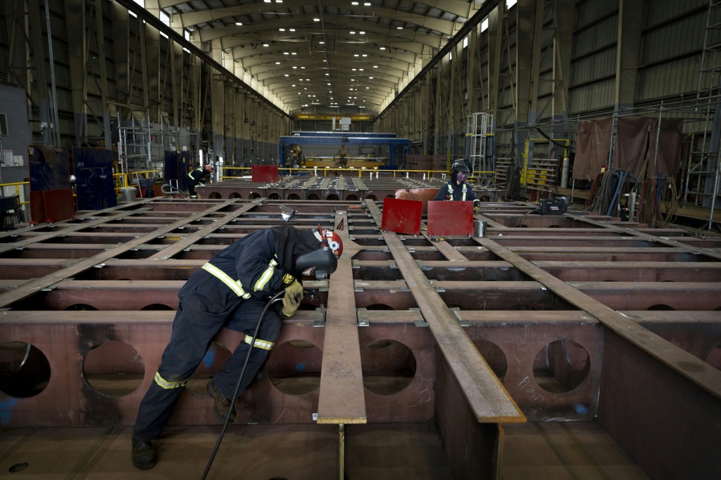 O navio é construído em um imenso hangar de um estaleiro em North Vancouver, no oeste do país, onde operários lixam longas vigas metálicas.