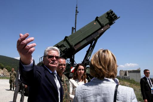 O presidente da Alemnaha, Joachim Gauck, observa baterias de mísseis Patriot em visita a base alemã em Kahramanmaras, Turquia, em 27 de abril de 2014 afp_tickers
