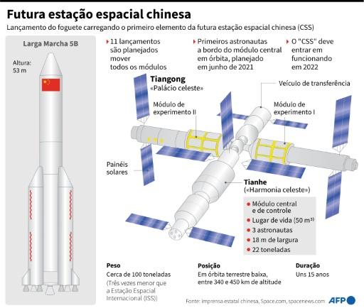 Uma vez concluída, a estação espacial chinesa, chamada Tiangong (“Palácio celeste”) em chinês, será similar à antiga estação soviética “Mir” (1986-2001).