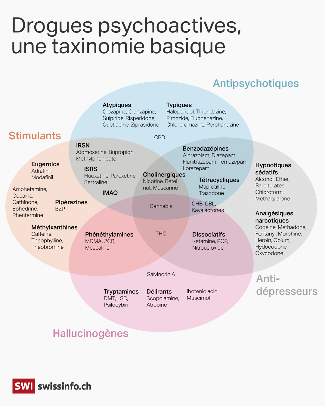 Os psicodélicos, um subgrupo de drogas psicoativas, podem alterar o humor, a cognição e as percepções. Ao fazer isso, eles criam conexões no cérebro. O LSD e a psilocibina são os psicodélicos mais conhecidos. Estes são os que foram propostos aos Hospitais Universitários de Genebra. Outros psicodélicos incluem o DMT e a mescalina, assim como o MDMA e a cetamina. São sobretudo acessíveis através de canais menos formais.