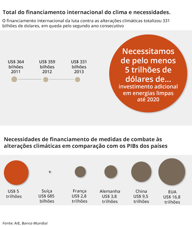 A Agência Internacional de Energia (AIE), também, prevê que US$ 5 trilhões tenham de ser investidos em energias limpas até 2020 para manter a elevação da temperatura dentro dos limites.