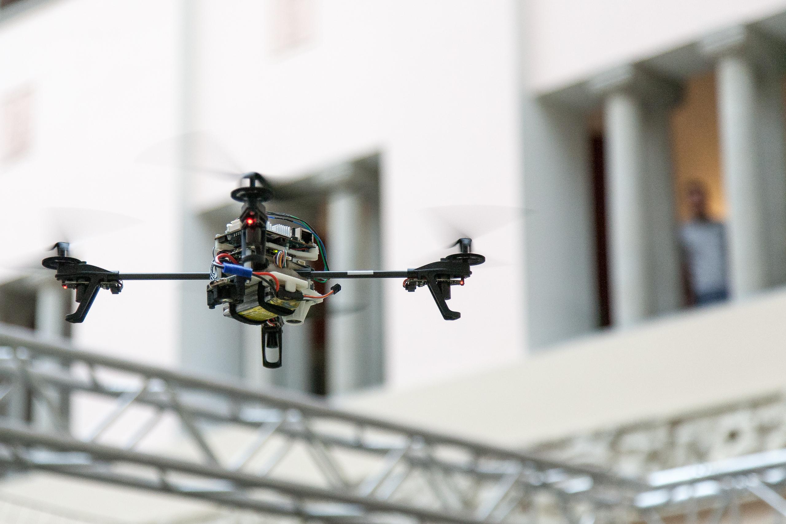 O Quadrokopter é completamente autônomo. Ele é equipado com sensores e computadores e não depende de sistemas externos, como GPS ou rádio, para se localizar.