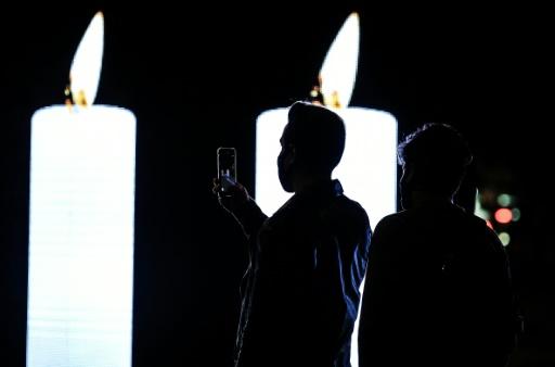 Um homem tira uma foto diante de um telão que projeta velas em homenagens às vítimas da COVID-19, em Bogotá, 6 de agosto de 2020 afp_tickers