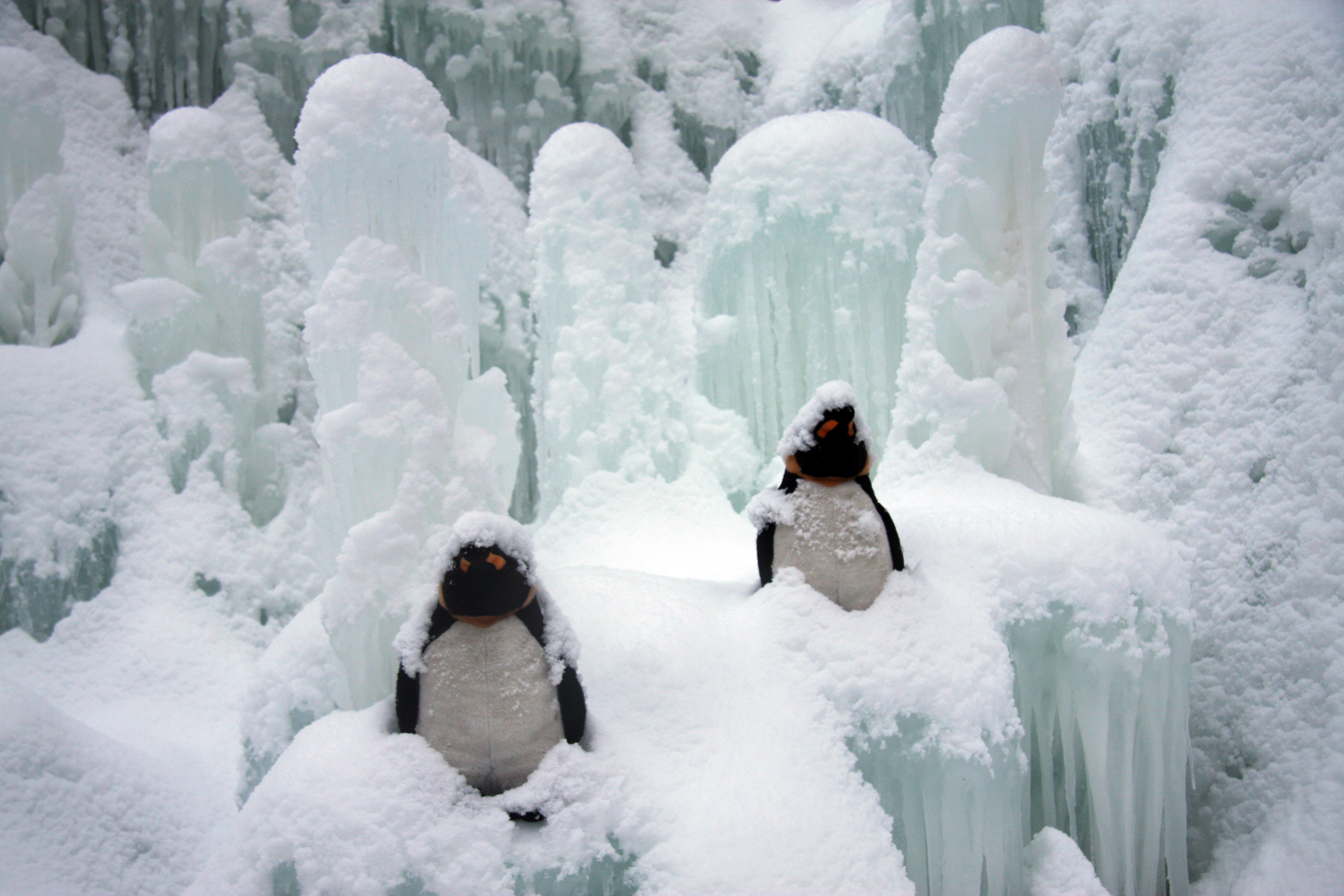 Pinguins de pelúcia numa paisagem ártica encantam as crianças na entrada do parque. (Geraldo Hoffmann, swissinfo.ch)