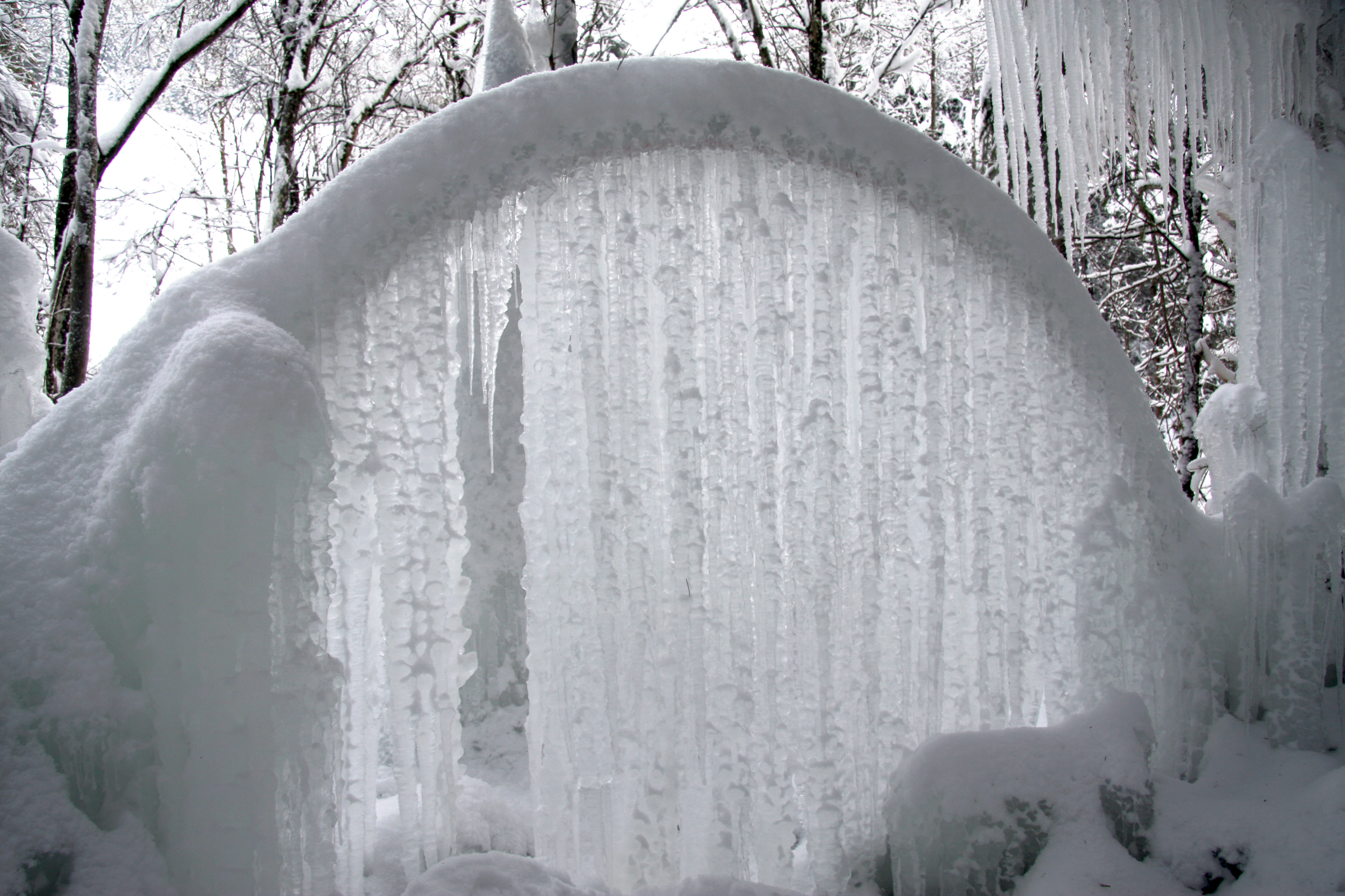 Cortina de gelo "presa" a um arco de madeira. (Geraldo Hoffmann, swissinfo.ch)