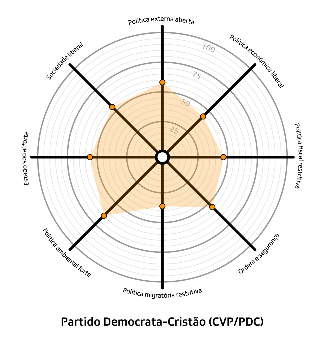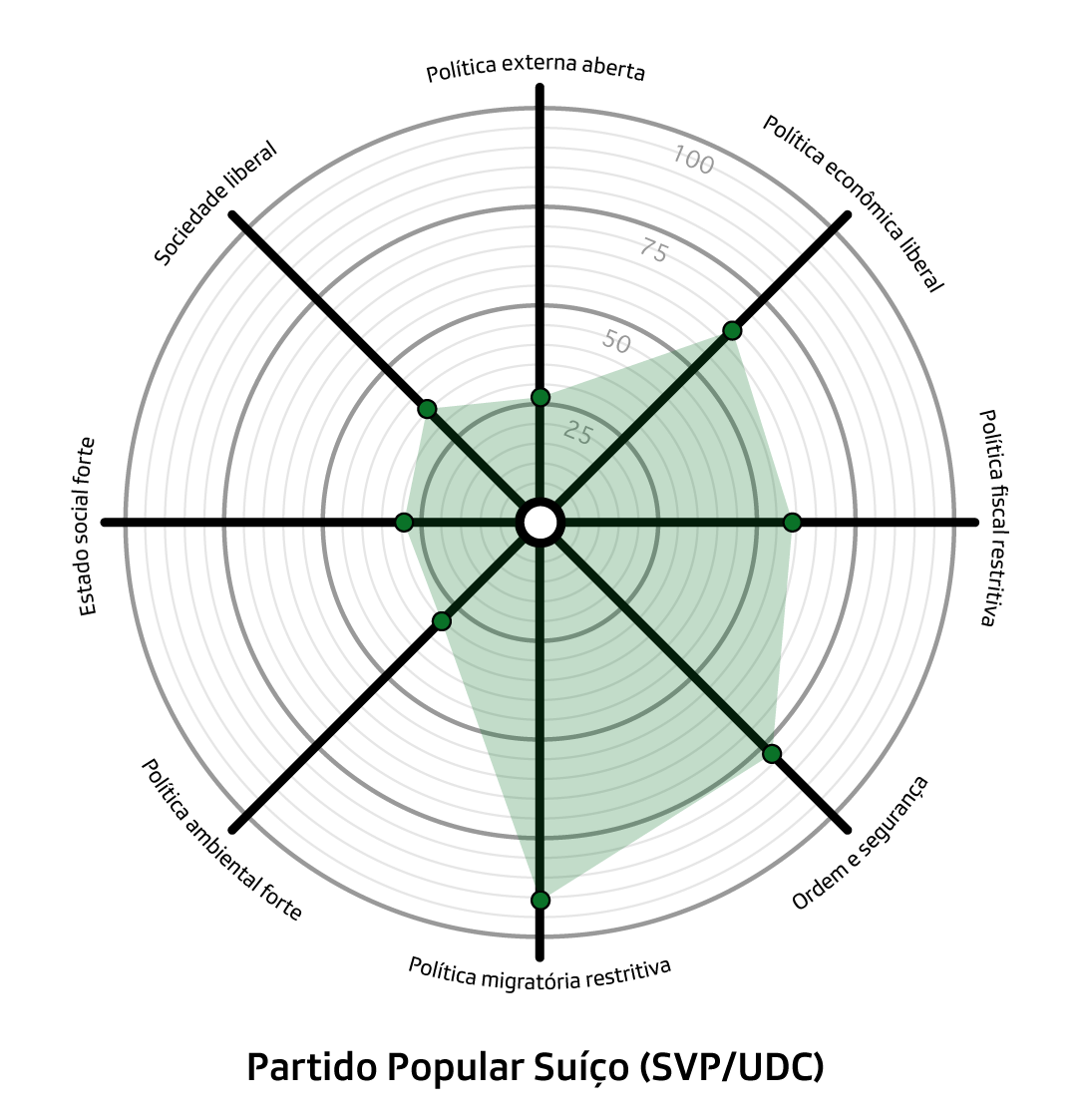 A escala para cada eixo do gráfico varia de um mínimo de 0 a um máximo de 100. Quanto maior for o valor, maior será o apoio do partido ao objetivo representado pelo eixo.