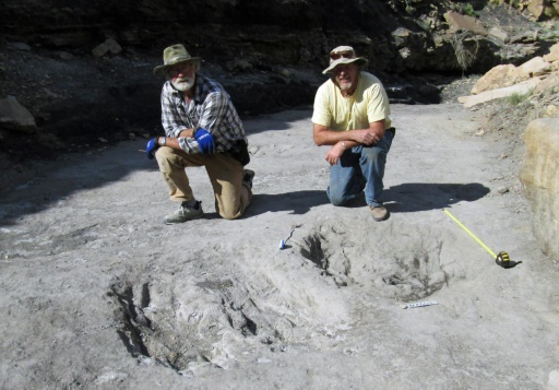 Os professores Martin Lockley (D) e Ken Cart mostram buracos do período Cretáceo, no Colorado, no dia 7 de janeiro de 2016 afp_tickers