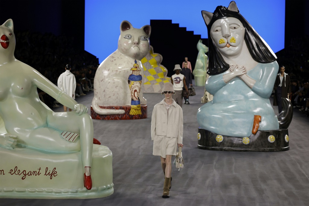 O estilista Kim Jones prestou homenagem ao artesanato nesta sexta-feira(21) no desfile da Dior em Paris, com roupas confortáveis, tamancos e estampas com desenhos quase infantis, em uma passarela repleta de gatos gigantes de cerâmica.