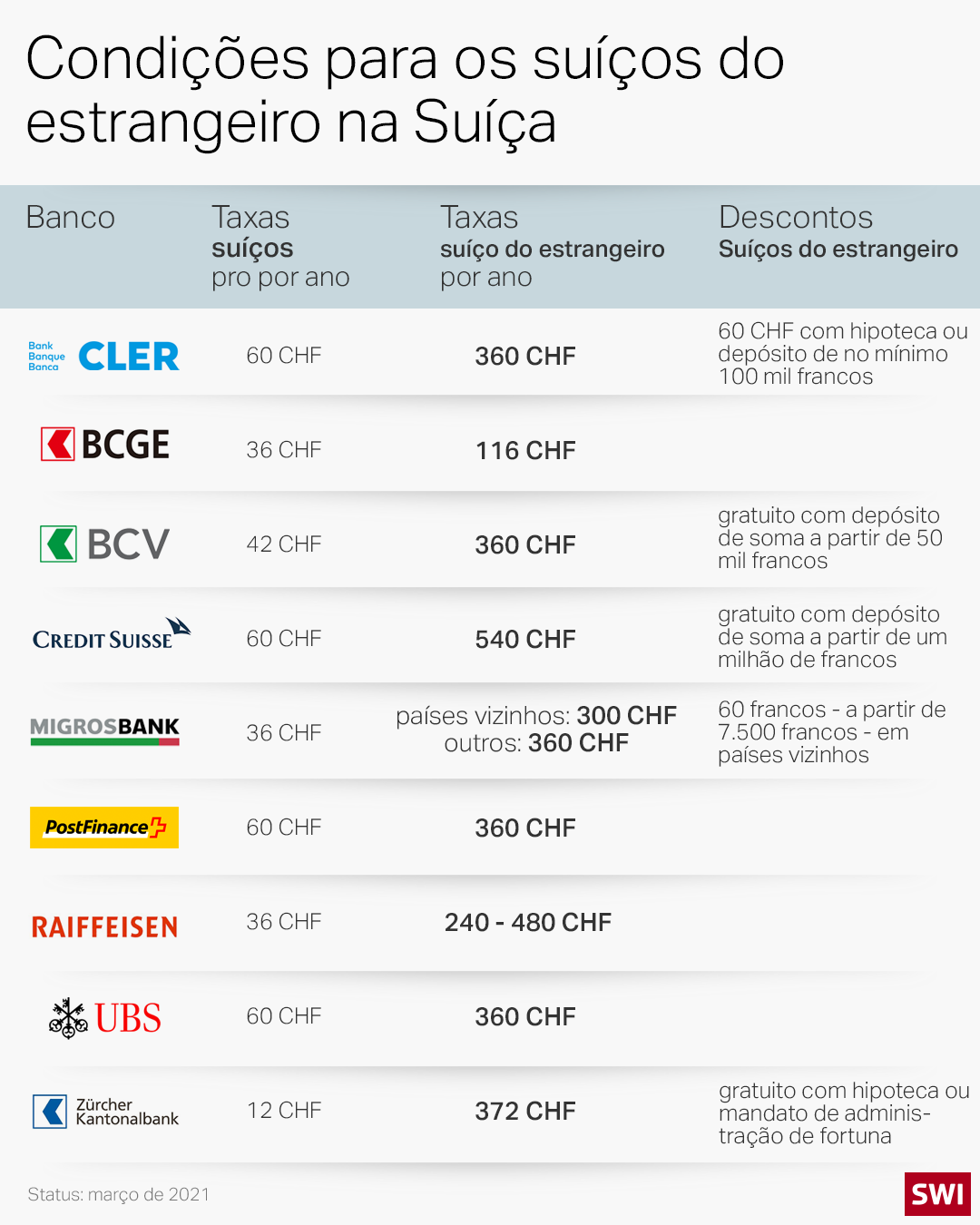 E quanto aos custos? Segundo o ZKB, a “taxa básica internacional” é de 360 francos suíços por ano. Isso é muito comparado aos 124 francos do Banco Cantonal de Genebra – e muito mais do que os 60 francos suíços que os clientes domésticos pagam pela conta mais barata no ZKB. Além disso, a nova oferta não é mais atrativa do que a de dois anos atrás. Na época, a swissinfo.ch comparou as várias ofertas dos bancos suíços.