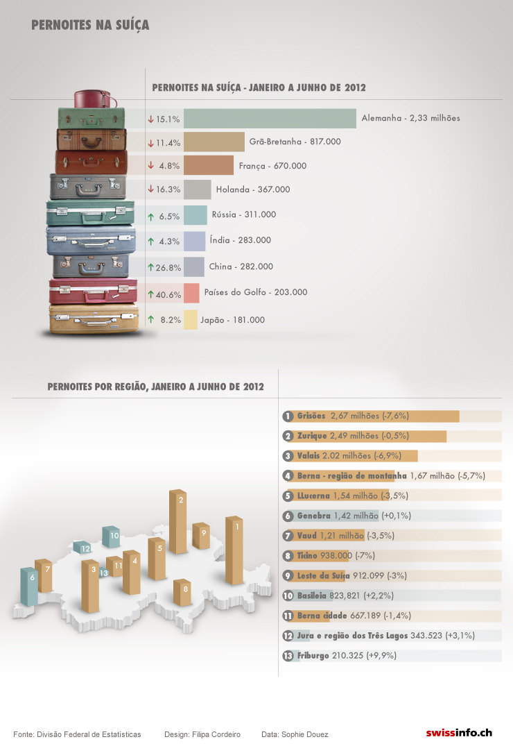 Os alemães são tradicionalmente os turistas mais numerosos na Suíça, mas vieram muito menos no primeiro semestre de 2012. No entanto, outros mercados se abrem compensando a redução do número de alemães.