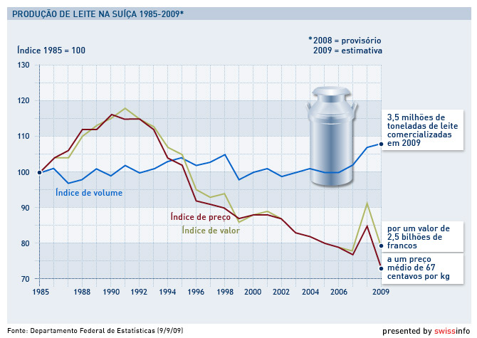 Os baixos preços do leite e de outros produtos do campo reduzem a renda dos agricultores suíços em 2009, segundo uma estimativa do Departamento Federal de Estatísticas (DFE).