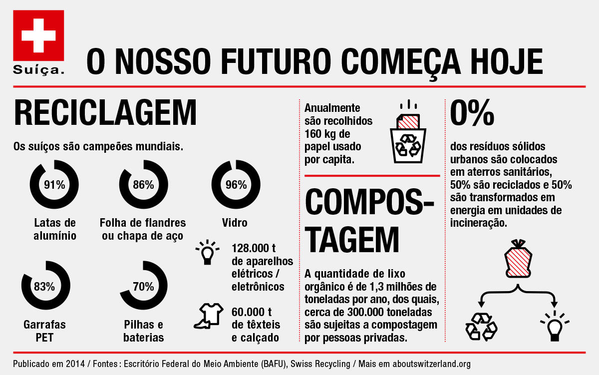 Produzido pela Presença SuíçaLink externo, uma unidade do ministério suíço das Relações Exteriores para promover a imagem do país no exterior, o gráfico declara a liderança do país em alguns quesitos: dente outros, que as taxas de reciclagem de vidro e latas de alumínio passaram de 90%.