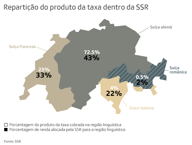 Dentro do sistema SRG, os recursos são divididos solidariamente entre as regiões linguísticas a fim de garantir que a oferta de mídia tenha o mesmo padrão de qualidade por todo o país e nas diferentes línguas. Um terço das taxas recolhidas nas regiões de língua alemã é redistribuído em outras regiões linguísticas.