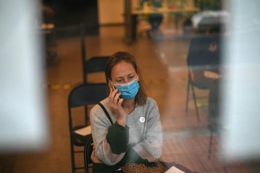 Uma mulher espera dentro de um centro de vacinação pop-up para a vacina ou reforço Covid-19, em Hammersmith e Fulham, na Grande Londres, em 3 de dezembro de 2021, conforme o lançamento se acelera na Inglaterra afp_tickers