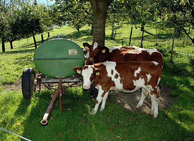 Alguns bezerros ficam no cercado embaixo do pomar.