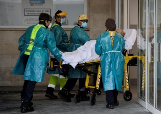 Trabalhadores da saúde levam paciente em uma maca para um hospital de Madri, em 12 de outubro de 2020, afp_tickers