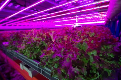Um halo de luz violeta banha dezenas de alfaces espalhadas em estantes de uma fazenda vertical no oeste da Bélgica, uma futura solução para alimentar a humanidade em climas hostis e nos momentos de perda de terra cultiváveis.