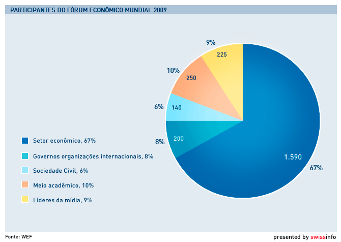 O Fórum Econômico Mundial 2009 vai reunir mais de 2.500 participantes de 91 países – cerca de 75% são lideranças econômicas, entre elas, 1.170 CEOs das maiores empresas do mundo.