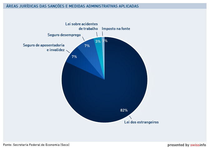 A partir dos controles, os cantões comunicaram à Seco 1.323 sanções aplicadas no ano passado (31,2% das infrações constatadas). A maioria dessas sanções ou medidas administrativas (1.078 ou 82%) referiu-se a transgressões à lei dos estrangeiros.
