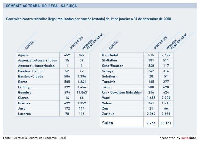 Com base numa lei em vigor desde 1° de janeiro de 2008, os 26 cantões (estados) criaram autoridades de fiscalização e contrataram 60 inspetores para combater o trabalho ilegal – chamado “trabalho no negro” (Schwarzarbeit, em alemão).