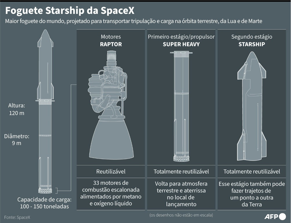 O foguete é composto por duas partes: a do propulsor Super Heavy, em cima, e o foguete Starship, o maior e mais poderoso já construído.
