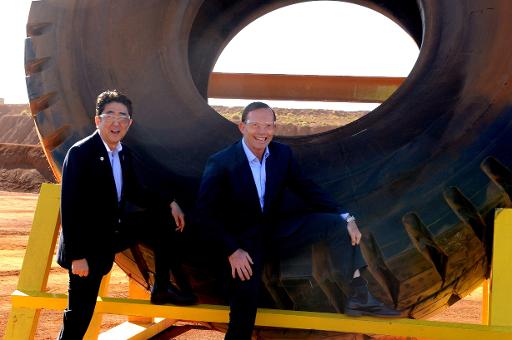 Tony Abbott e Shinzo Abe visitaram uma mina do grupo Rio Tinto na região de Pilbara, oeste da Austrália.