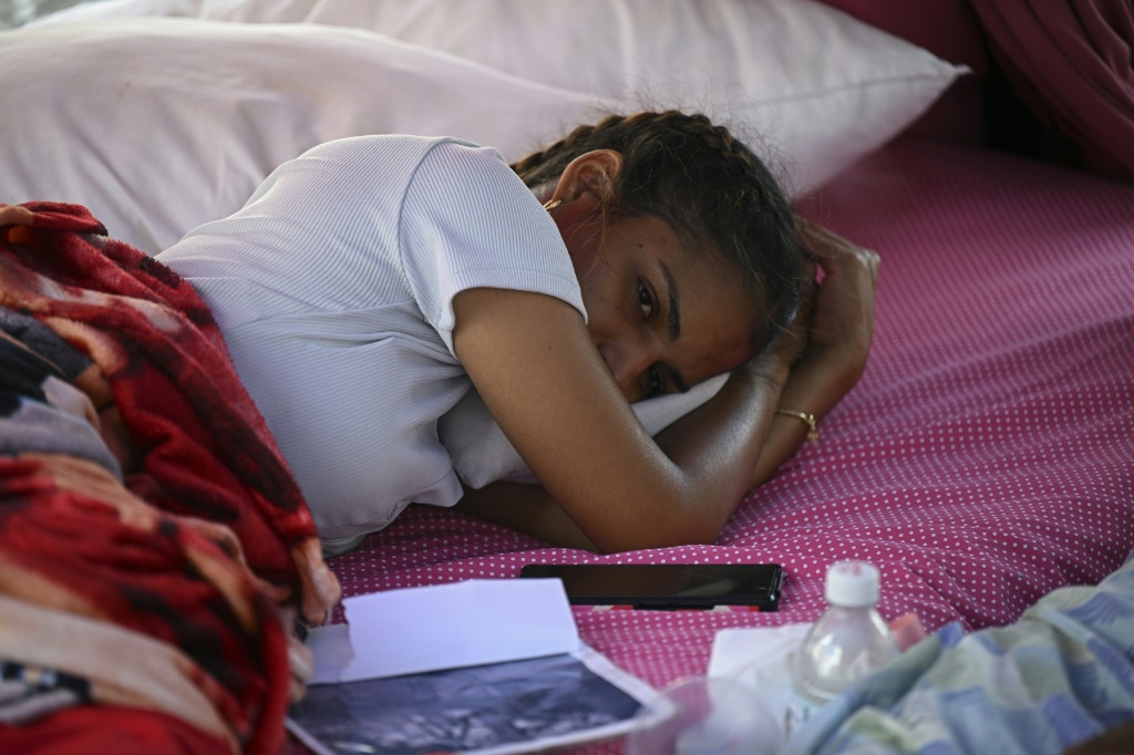 Sob um toldo vermelho, quatro mulheres, de um grupo inicial de dez, permanecem deitadas em colchões sobre o asfalto. Elas recebem revisões médicas constantes porque estão fracas e mal conseguem ficar de pé.