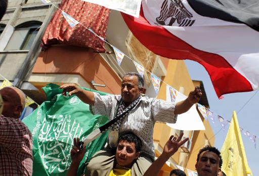 Palestinos cantam em favor do governo de reconciliação nacional, no sul da Faixa de Gaza afp_tickers