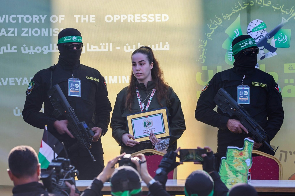 Antes de ser libertada, ela foi exibida em um palco junto com membros do Hamas armados e mascarados, enquanto carregava nas mãos um diploma e saudava o público a pedido dos milicianos islamistas.
