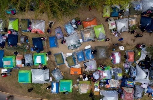 Vista aérea de cidadãos bolivianos em um acampamento improvisado em frente ao consulado da Bolívia em Santiago, em 2 de junho de 2020, aguardando uma solução para retornar ao seu país, depois que as fronteiras foram fechadas devido à pandemia de COVID-19. afp_tickers