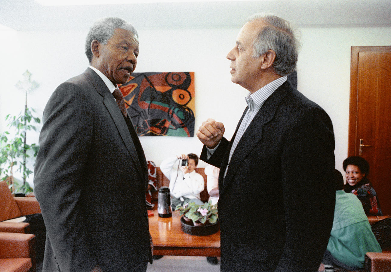 Ziegler recebeu Nelson Mandela em Genebra em 1990 em nome do Movimento Anti-Apartheid da Suíça. O socialista suíço manteve estreitos contatos com as maiores lideranças anticoloniais e anti-imperialistas dos últimos 50 anos. Algumas, porém, lhe causaram sérias controvérsias, como o ex-homem forte da Líbia, Muammar Gadafi. Keystone / Str