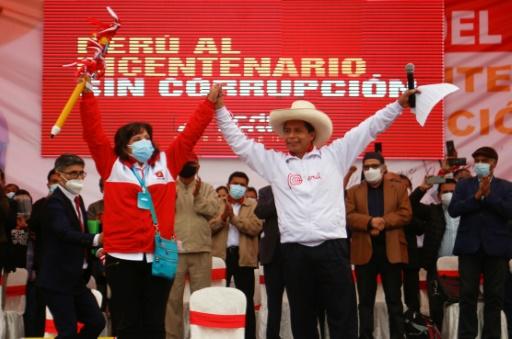 O candidato presidencial de esquerda peruano pelo partido Peru Libre, Pedro Castillo (D), e sua vice-presidente, Dina Boluarte, no norte de Lima, em 18 de maio de 2021. afp_tickers