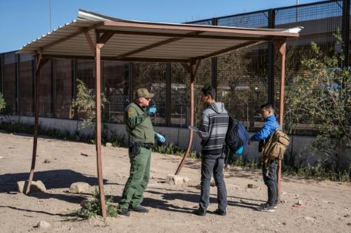 Migrantes salvadorenhos conversam com um guarda de fronteira dos Estados Unidos após cruzar o rio Grande para pedir asilo no Texas afp_tickers