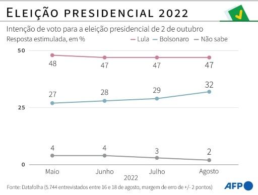 Lula, 76 anos, mantém 47% das intenções de voto para o pleito de 2 de outubro, contra 32% para o presidente, de acordo com uma nova consulta do instituto Datafolha.