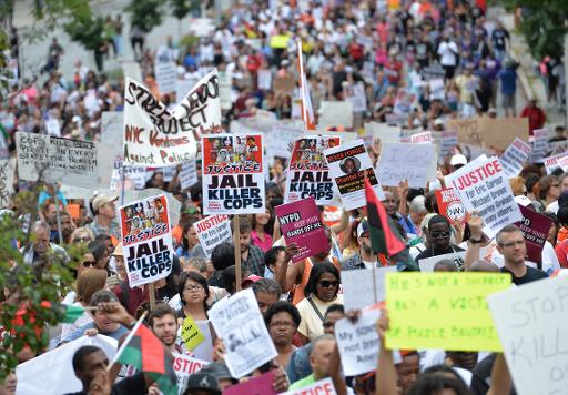 A manifestação acontece após duas semanas de protestos pela morte do jovem negro Michael Brown, de 18 anos, que levou seis tiros de um policial branco, em 9 de agosto, em Ferguson (estado do Missouri, centro dos Estados Unidos).
