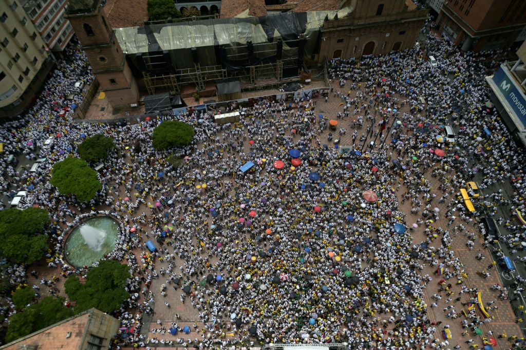 A chuva na capital não desanimou os manifestantes, e milhares avançaram em direção à Praça de Bolívar, próxima à sede presidencial.