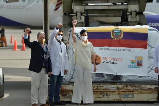 (21 jan) Zevallos (e) posa com carregamento das primeiras doses da vacina Pfizer/BioNTech, no aeroporto internacional de Quito afp_tickers