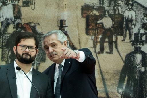 O presidente do Chile, Gabriel Boric (E), conversa com o colega argentino, Alberto Fernandez (D), antes de assinar acordos de cooperação em Buenos Aires em 4 de abril de 2022 afp_tickers