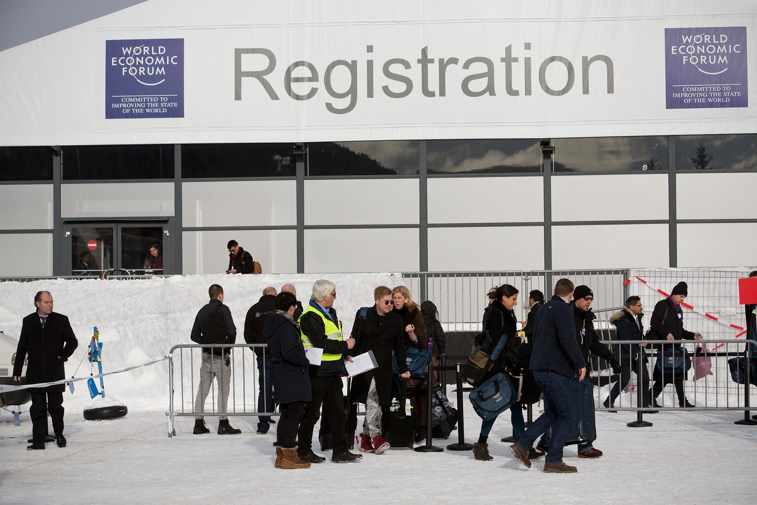 Os participantes do fórum na saída do centro de registro. Essa é a barreira que separa as pessoas "normais" daquelas que têm direito ao cobiçado crachá do WEF.