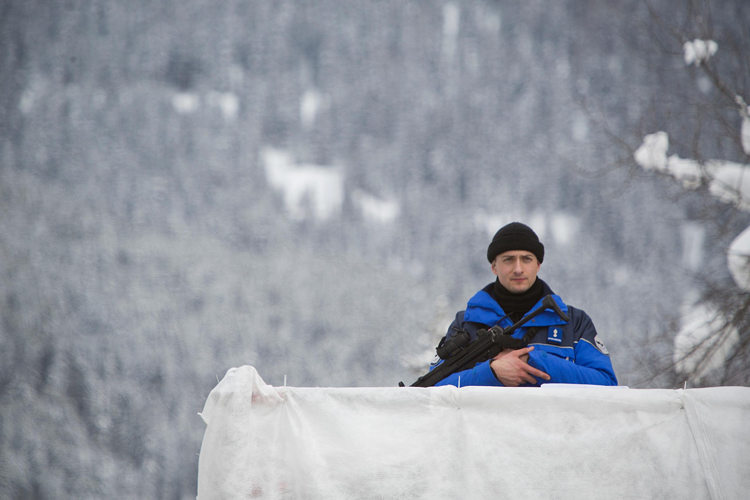 Um membro da polícia vigia a entrada do centro de congressos onde é realizado o Fórum Econômico Mundial.