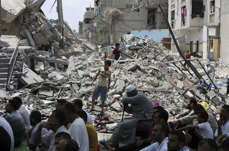 Palestinos rezam perto de restos de mesquita na Faixa de Gaza nesta sexta-feira. REUTERS/Ibraheem Abu Mustafa reuters_tickers