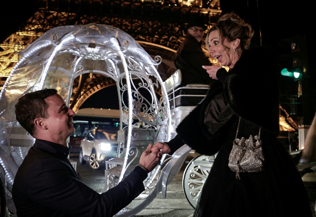 Na Praça Vendôme, o casal sobe a bordo da carruagem e se deixa levar pelos bairros abastados de Paris até a Torre Eiffel. Ao som de um violinista, o homem, de joelhos, pede a mão de sua namorada, de 40 anos.
